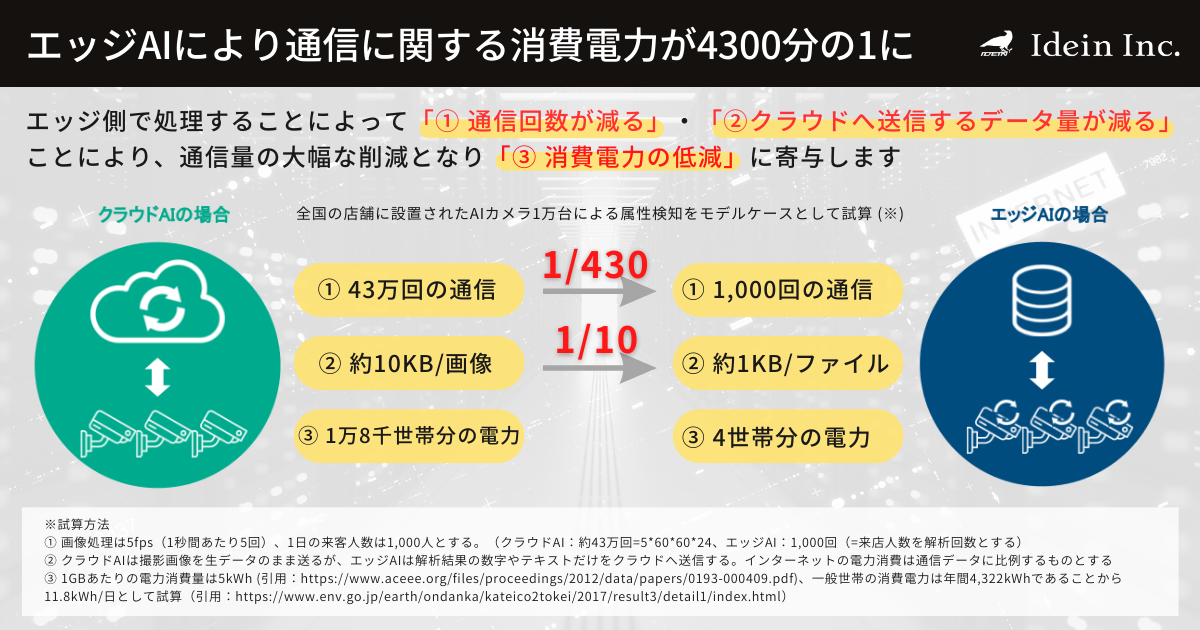 一方でエッジAIは無駄なデータの送受信が行われないため、通信量の削減に大きく寄与します。例えば、下図のユースケースで試算すると、データをデータセンターに送信した場合の1日当たりの消費電力はクラウドAIで1万8千世帯分になりますが、エッジAIではわずか4世帯分となり、その差は歴然です。
